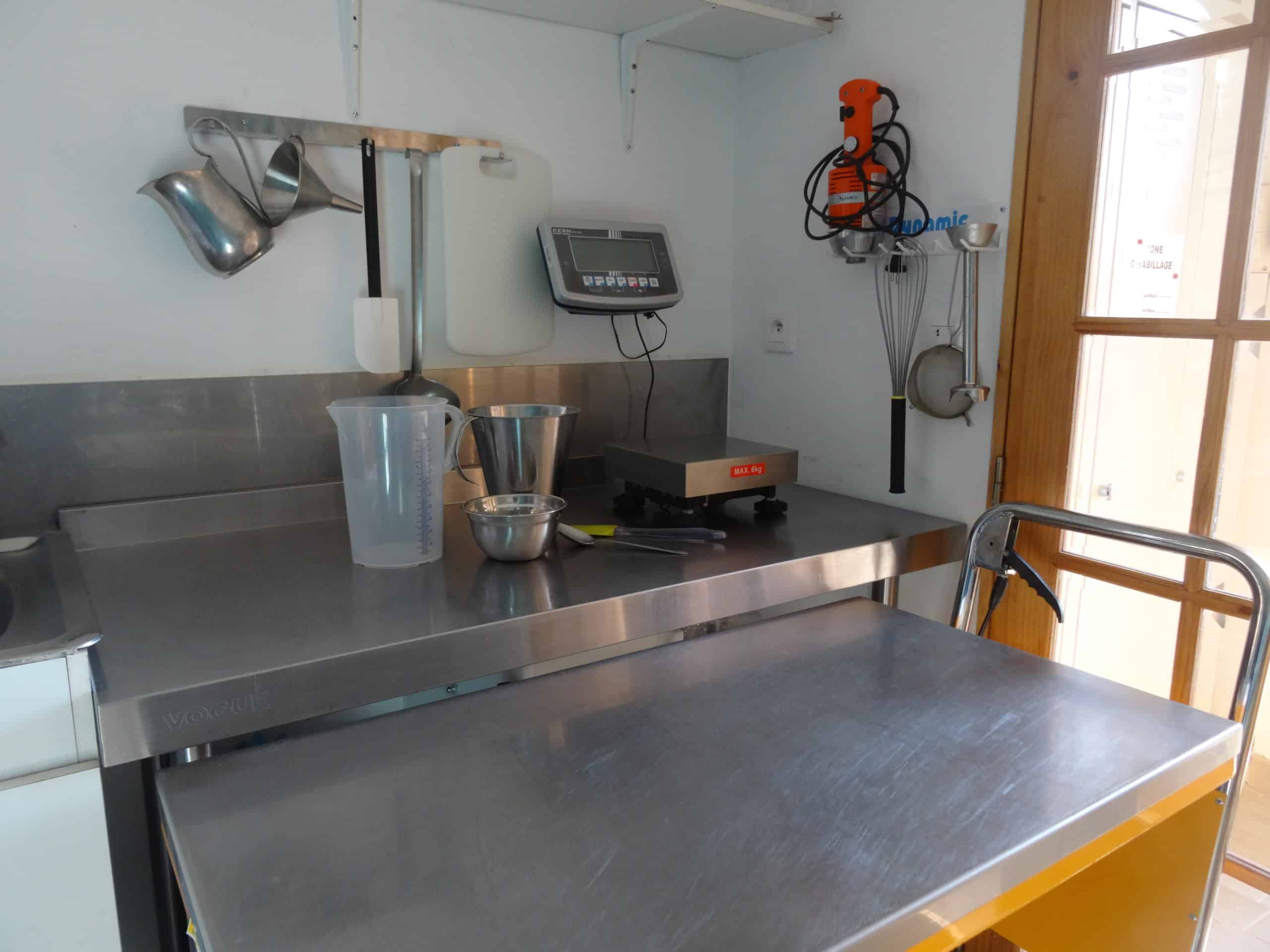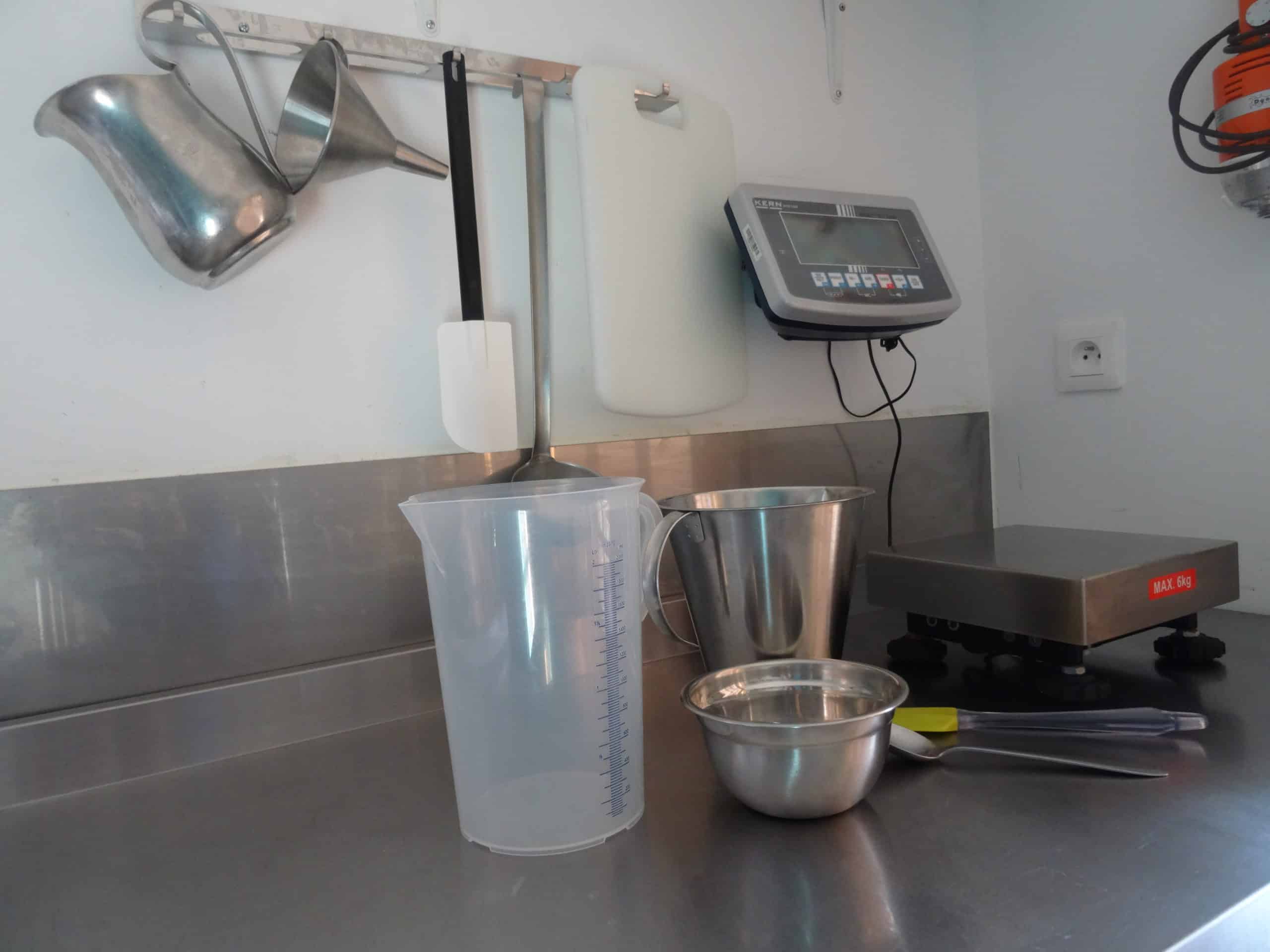 Ça ressemble à une cuisine finalement, mais avec un mixeur professionnel, une marmite et des ustensiles aux tailles adaptées aux besoins de la production, des balances professionnelles, etc.
